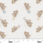 This charming fabric features a delightful pattern of gray and multi-colored flying teddy bears, each holding pastel balloons. The design is playful and whimsical, with teddy bears in various poses against a light background, creating a soft and inviting look perfect for children's projects. The teddy bears are detailed with bows and are surrounded by small stars, adding to the magical feel of the fabric. Ideal for creating baby blankets, nursery decor, or any project that needs a touch of sweetness.