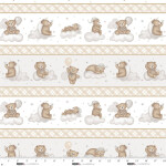 This charming fabric features a delightful border stripe design with an oatmeal and gray color palette. The pattern showcases adorable teddy bears engaged in various playful activities such as holding balloons, sitting on clouds, and interacting with moons and stars. The design repeats every 12 inches, creating a whimsical and soothing visual effect perfect for baby and children's projects. The fabric's soft and gentle tones make it ideal for creating a calming nursery environment.
